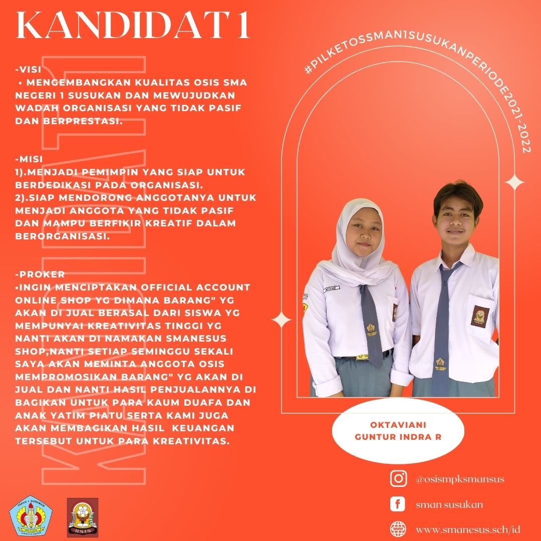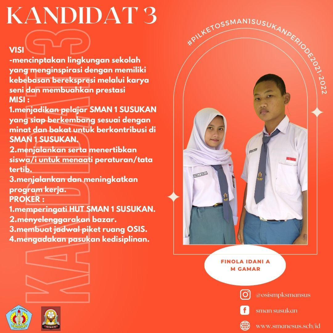Ketiga Kandidat/Paslon diatas adalah siswa/siswi terpilih yang akan melanjutkan kepengurusan OSIS Periode 2021/2022 yang mudah-mudahan dapat membawa Organisasi OSIS SMAN 1 Susukan lebih kreatif dan lebih baik lagi.